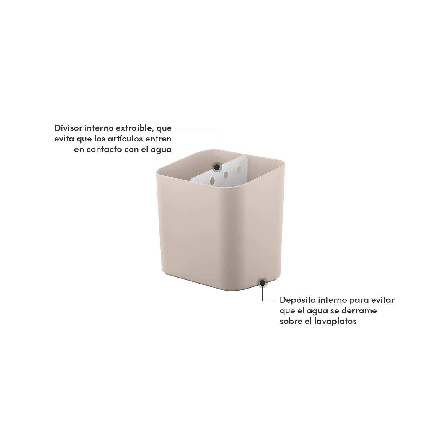 Tiene un depósito interno que evita que el agua se escurra sobre el lavaplatos. Además de que la partición interna es extraíble, y no permite que los cubiertos entren en contacto con el agua. Fabricado en material resistente y flexible (Polipropileno), además de que el plástico está texturizado, reduciendo riesgos y facilitando la higiene.