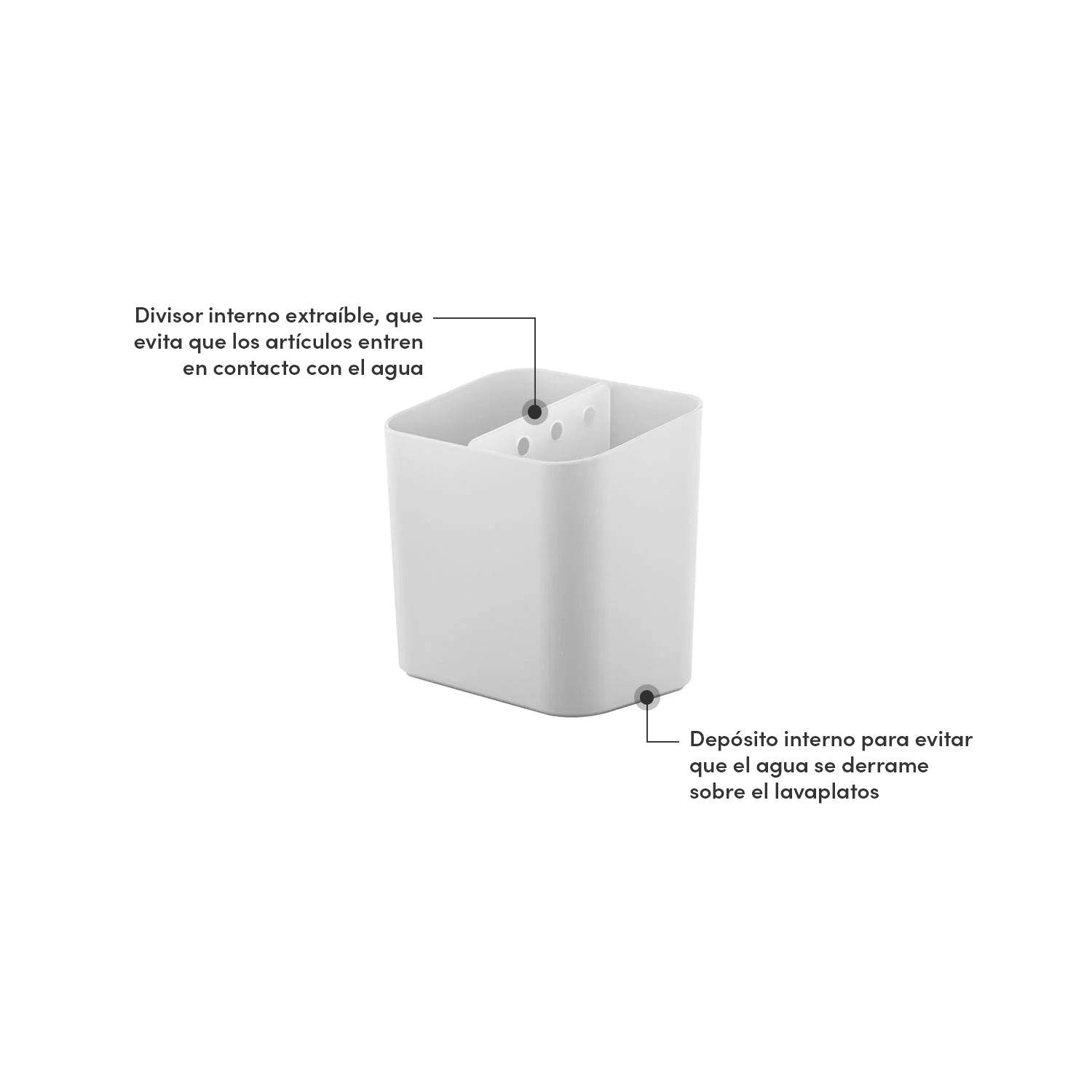 Tiene un depósito interno que evita que el agua se escurra sobre el lavaplatos. Además de que la partición interna es extraíble, y no permite que los cubiertos entren en contacto con el agua. Fabricado en material resistente y flexible (Polipropileno), además de que el plástico está texturizado, reduciendo riesgos y facilitando la higiene.