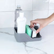 Diseño funcional con compartimentos para detergente, esponja y barra de jabón, lo que permite mantener todos los elementos de lavado organizados en un solo lugar y evita escurrimiento de agua hacia muebles o cajones.