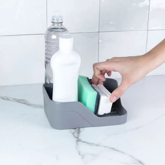 Para organizar detergente, jabón y esponja junto al lavaplatos en cocinas de uso diario.