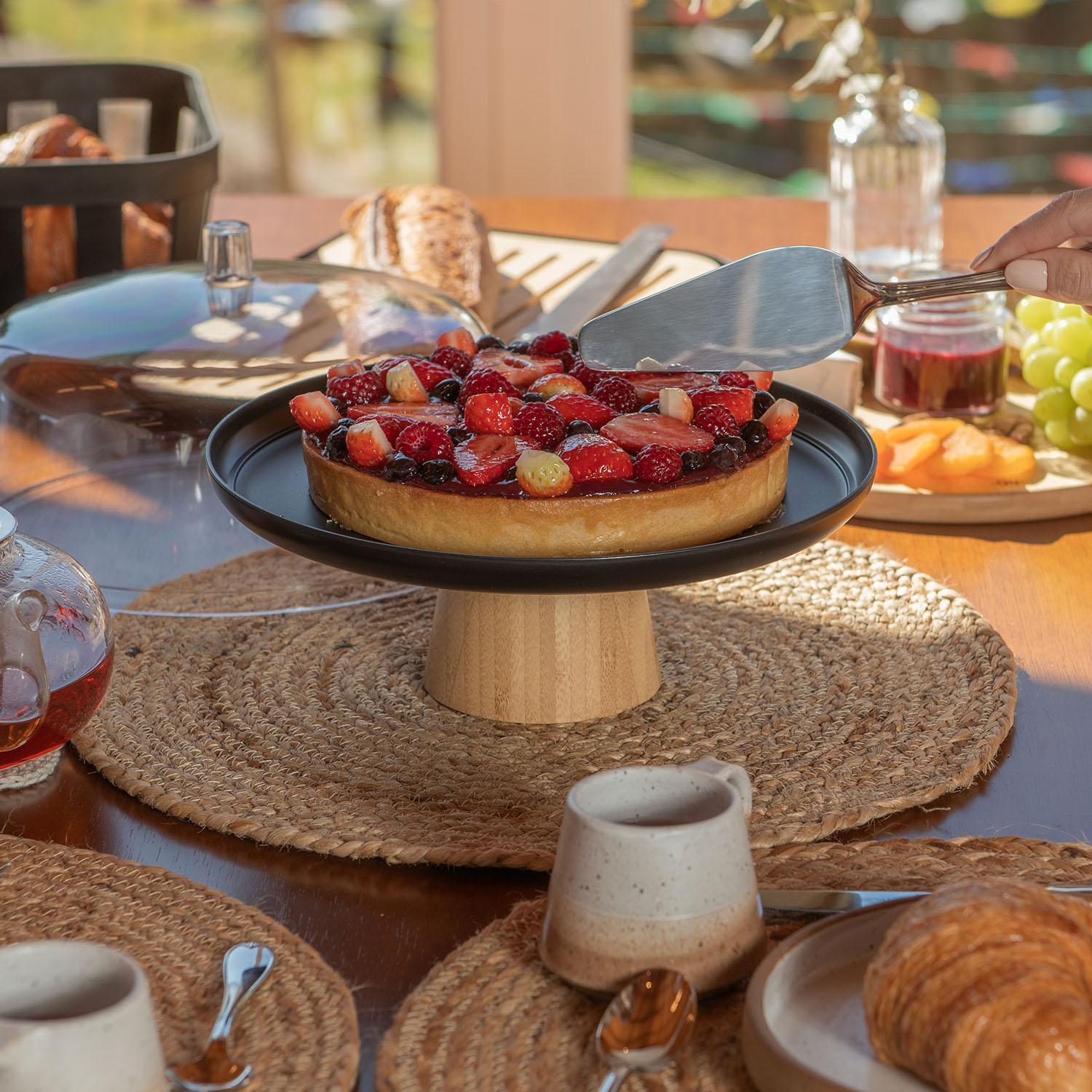 El porta tortas con pedestal Lume es perfecto para servir pasteles, dulces y bocadillos con encanto y sofisticación. Su diseño minimalista invita a disfrutar de cada momento en la mesa rodeado de comodidad, combinando una base de bambú con una cúpula de plástico altamente transparente.