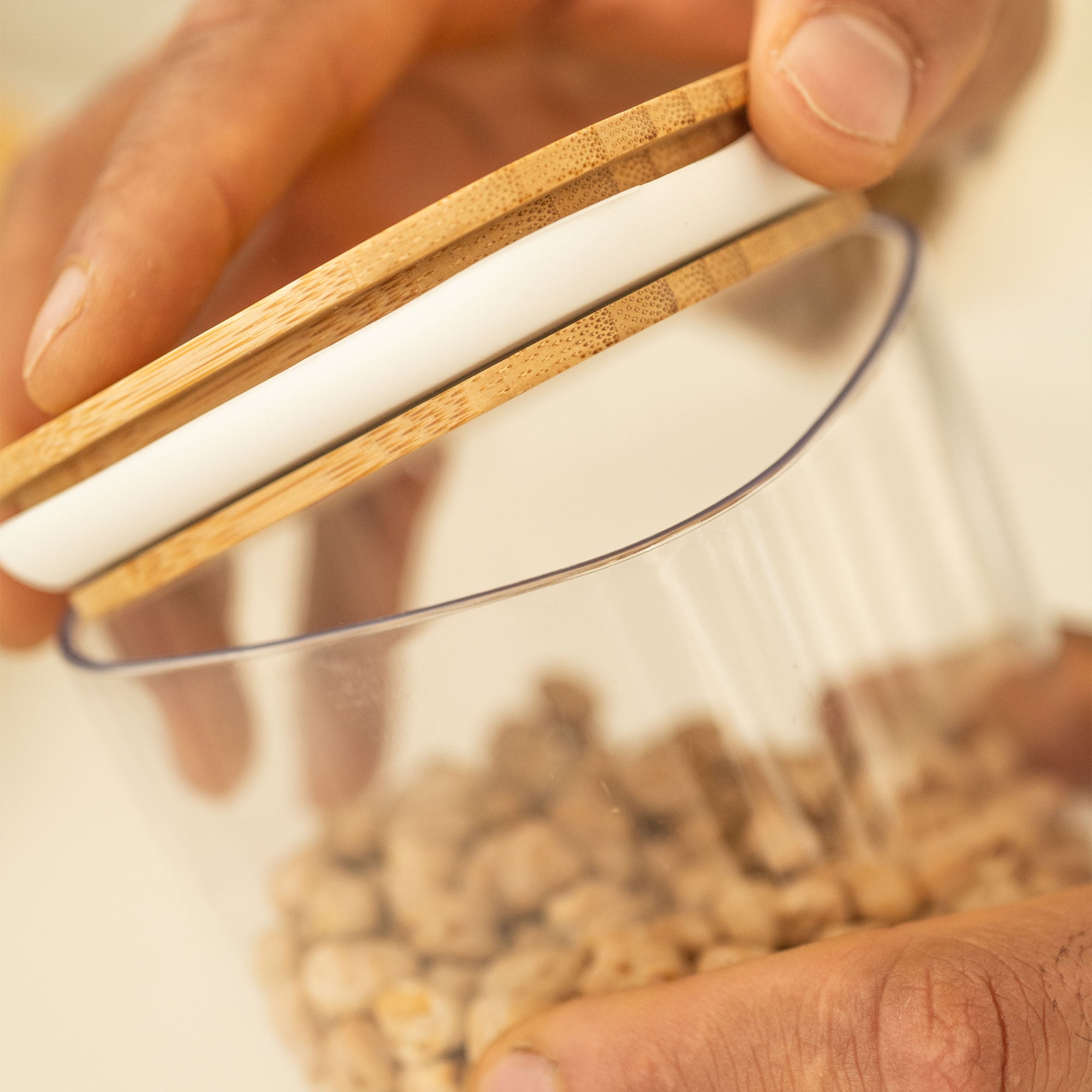 El contenedor hermético Keep 450 ml garantiza organización y cuidado de tus condimentos. La transparencia hace que sea más fácil de ver, aportando más tranquilidad y bienestar a tu rutina. La tapa de bambú promueve la sostenibilidad de un material 100% renovable, y aporta sofisticación a la decoración de tu hogar.