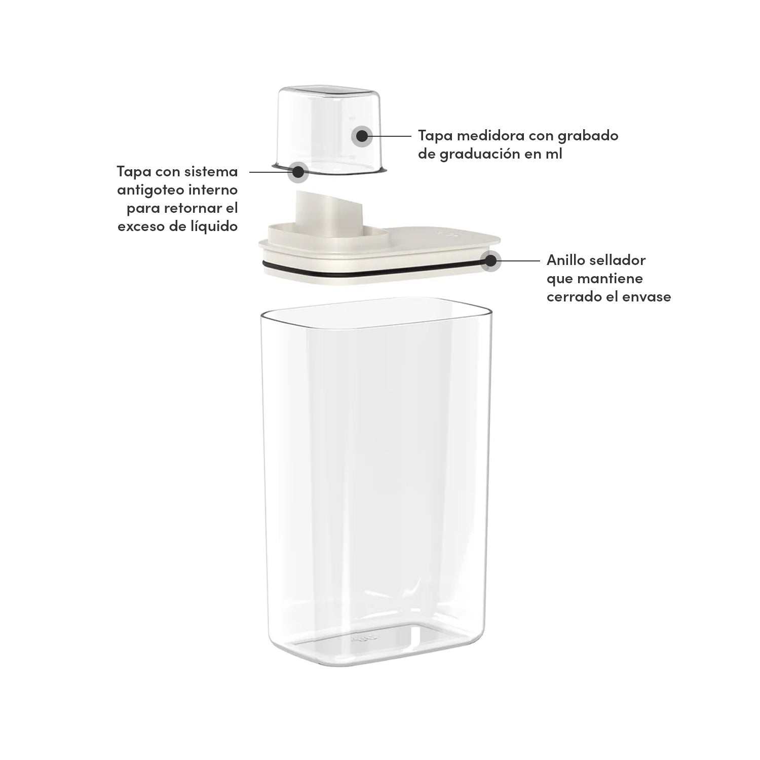 El dispensador Flow de 2,3 L es la solución ideal para almacenar una variedad de productos de limpieza como suavizante, detergente en polvo y desinfectante. Su transparencia facilita la gestión visual del producto.