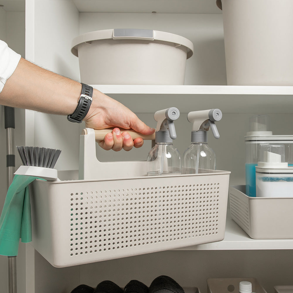 Transporta y almacena tus esenciales de limpieza de forma práctica y estilosa.